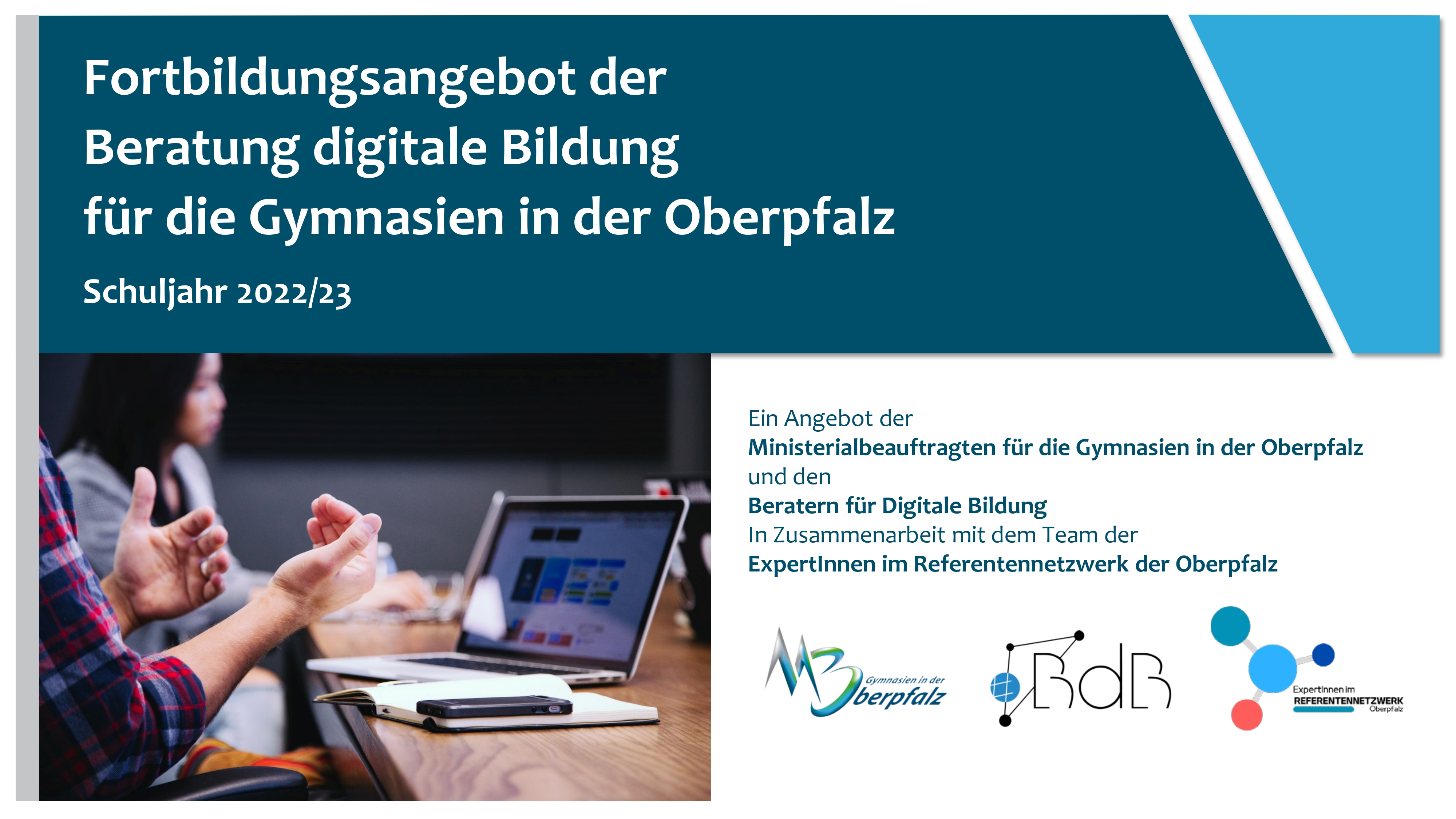 Die Berater für Digitale Bildung haben in Zusammenarbeit mit dem ExpertInnen im Referentennetzwerk einen neuen und aktualisierten Fortbildungskatalog für die Gymnasien der Oberpfalz zusammengestellt. In acht Modulen werden 18 verschiedene Fortbildungen angeboten. Alle Angebote sind den Kompetenzbereichen und Niveaustufen des DigCompEdu Bavaria zugeordnet und können einzeln, als Paket oder als Gesamtangebot in Anspruch genommen werden.